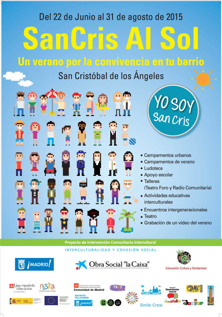 San Cris Al Sol: Un verano por la convivencia en tu barrio, es un ejemplo de un barrio que colabora y apuesta por la convivencia de todos y todas. Ello sólo es posible gracias al esfuerzo colectivo de todas las Asociaciones y recursos: Asociación de vecinos La Unidad de San Cristóbal, Asociación Educación, Cultura y Solidaridad, Basurama, Casa San Cristóbal (Fundación Montemadrid), CEIP Azorín, Centro de Mayores Maria Zambrano, Club de amig@s de San Cristóbal, Junta Municipal de Villaverde (Departamento de Servicios Sociales), Liga Española de la Educación, Movimiento Junior, OMC Radio, Parroquias, Proyecto de Intervención Comunitaria Intercultural de San Cristóbal, Smile Crew, Teatro 3Social.