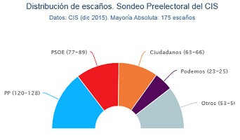 Ese porcentaje de apoyo otorgaría al PP, según en CIS, entre 120 y 128 escaños, a 50 escaños de la mayoría absoluta (176 diputados), pero con una distancia respecto a sus inmediatos perseguidores, que aparecen casi empatados: al PSOE se le atribuyen entre 77 y 89 escaños con su 20,8%, y a Ciudadanos se le calculan entre 63 y 68 diputados con el 19%.